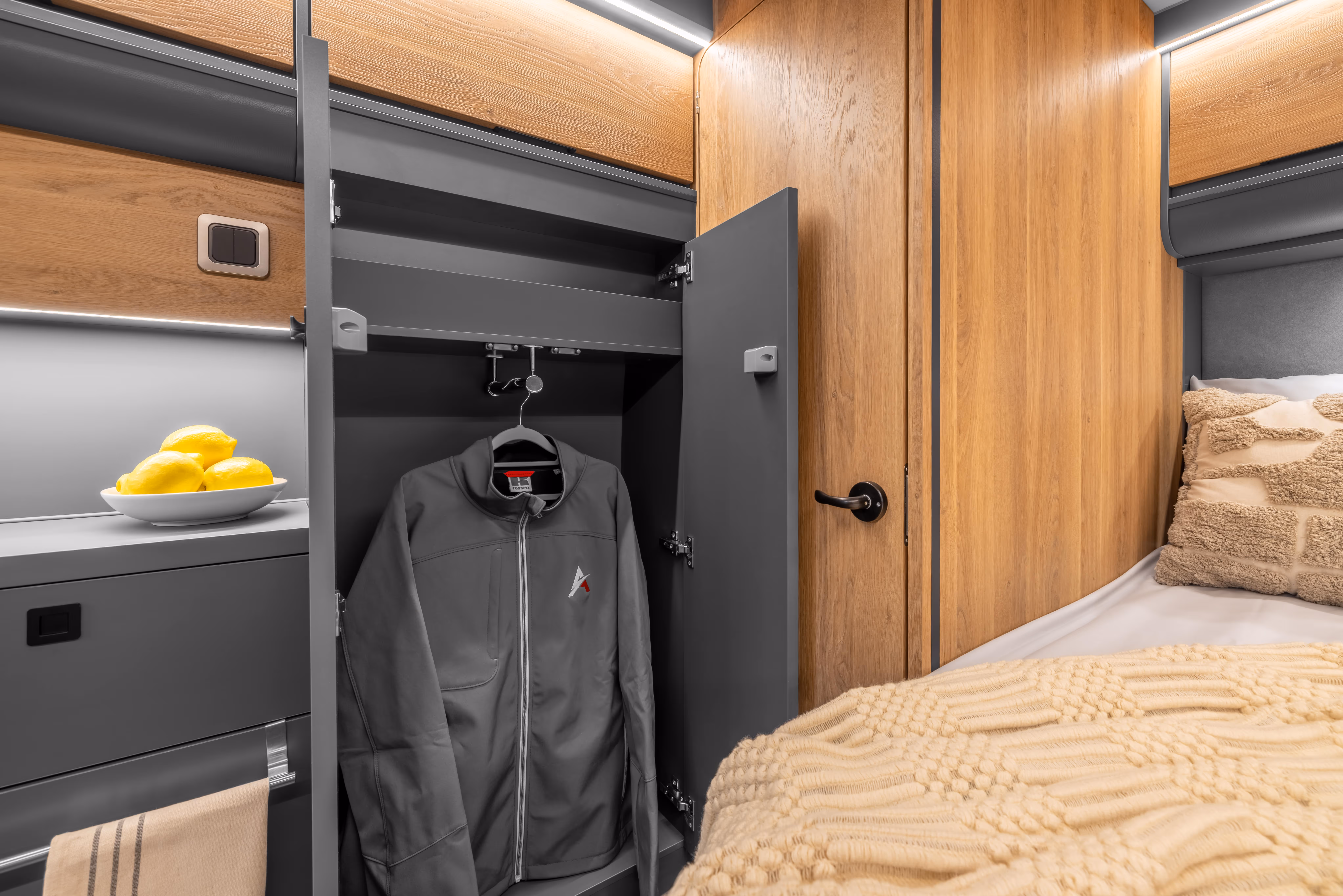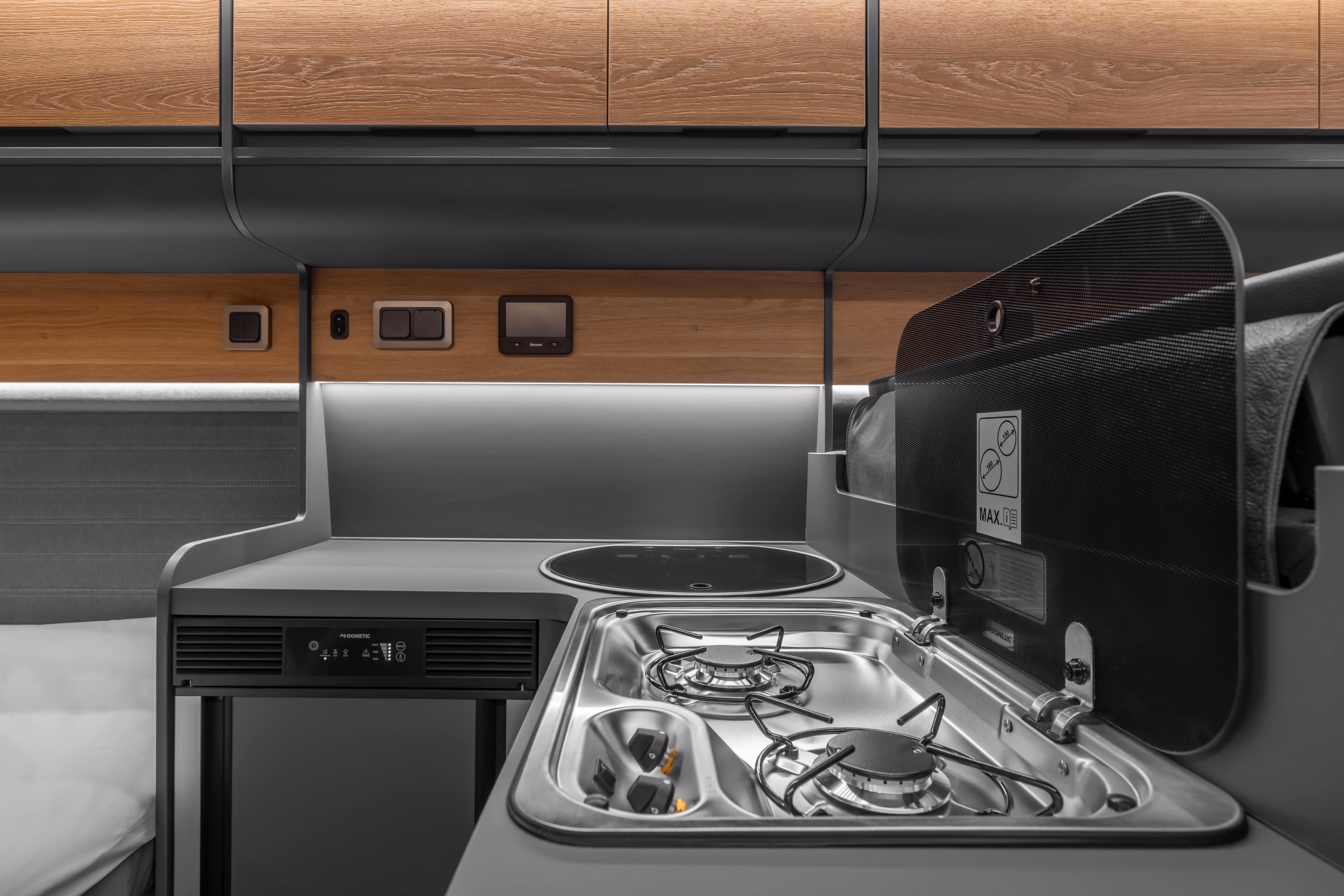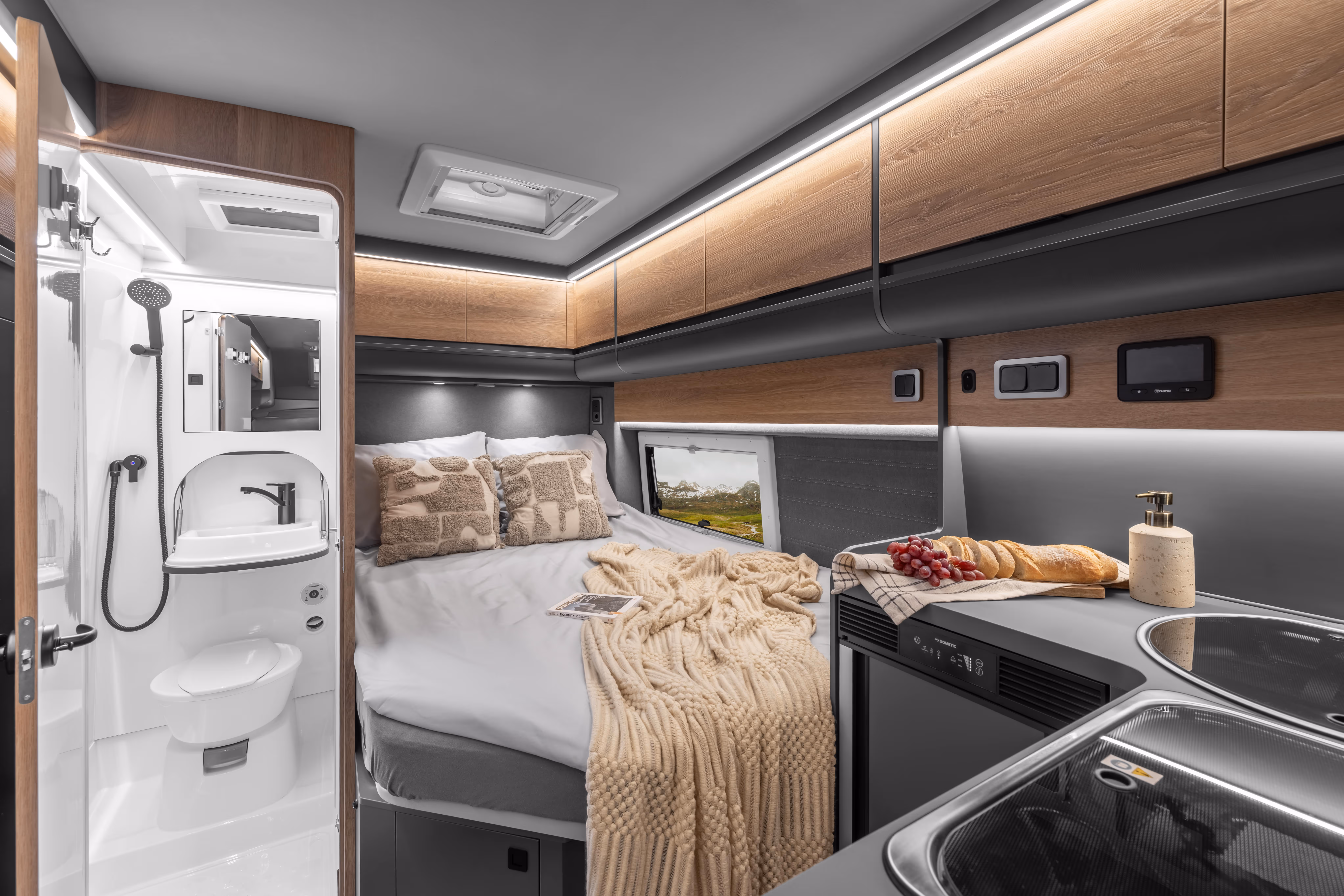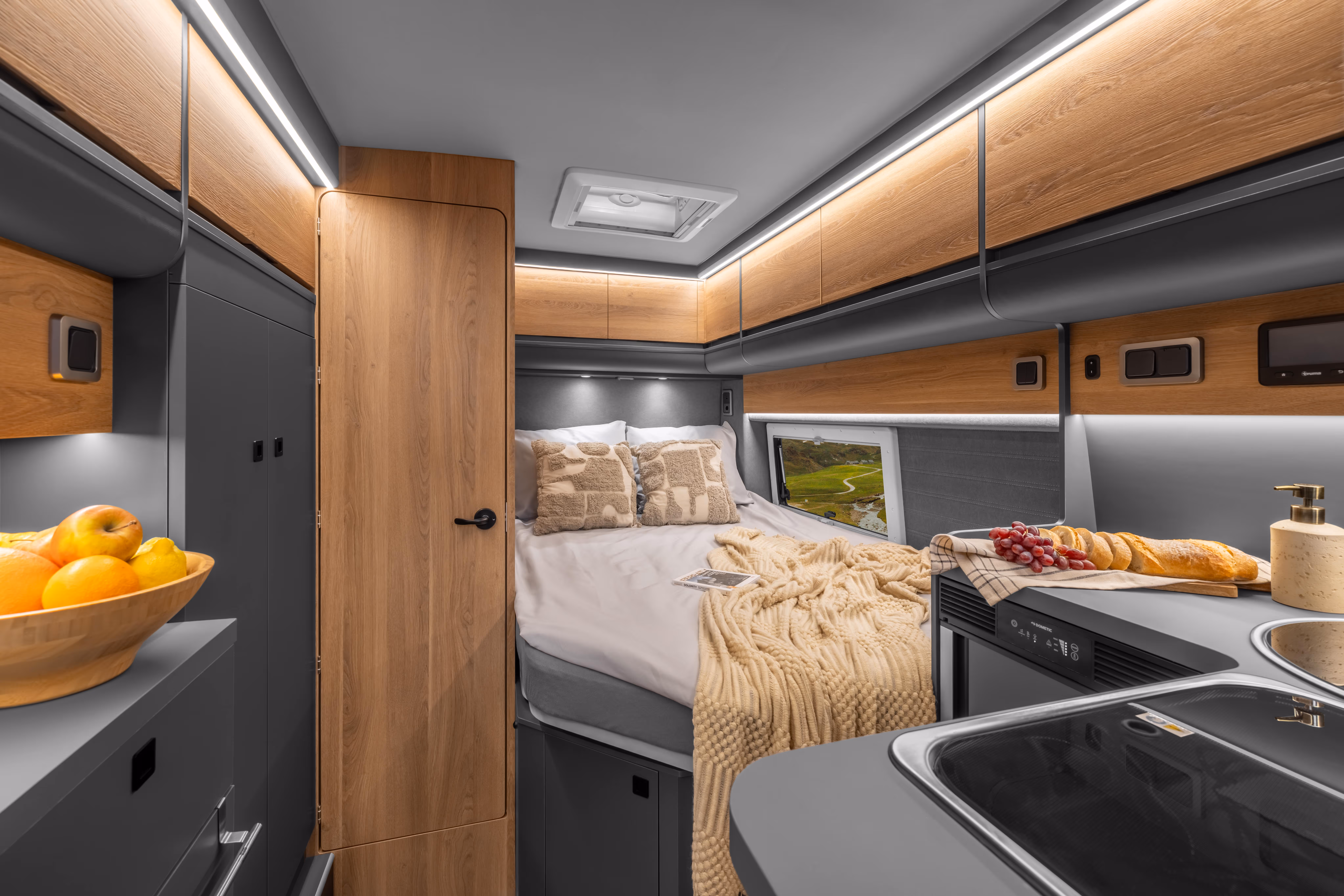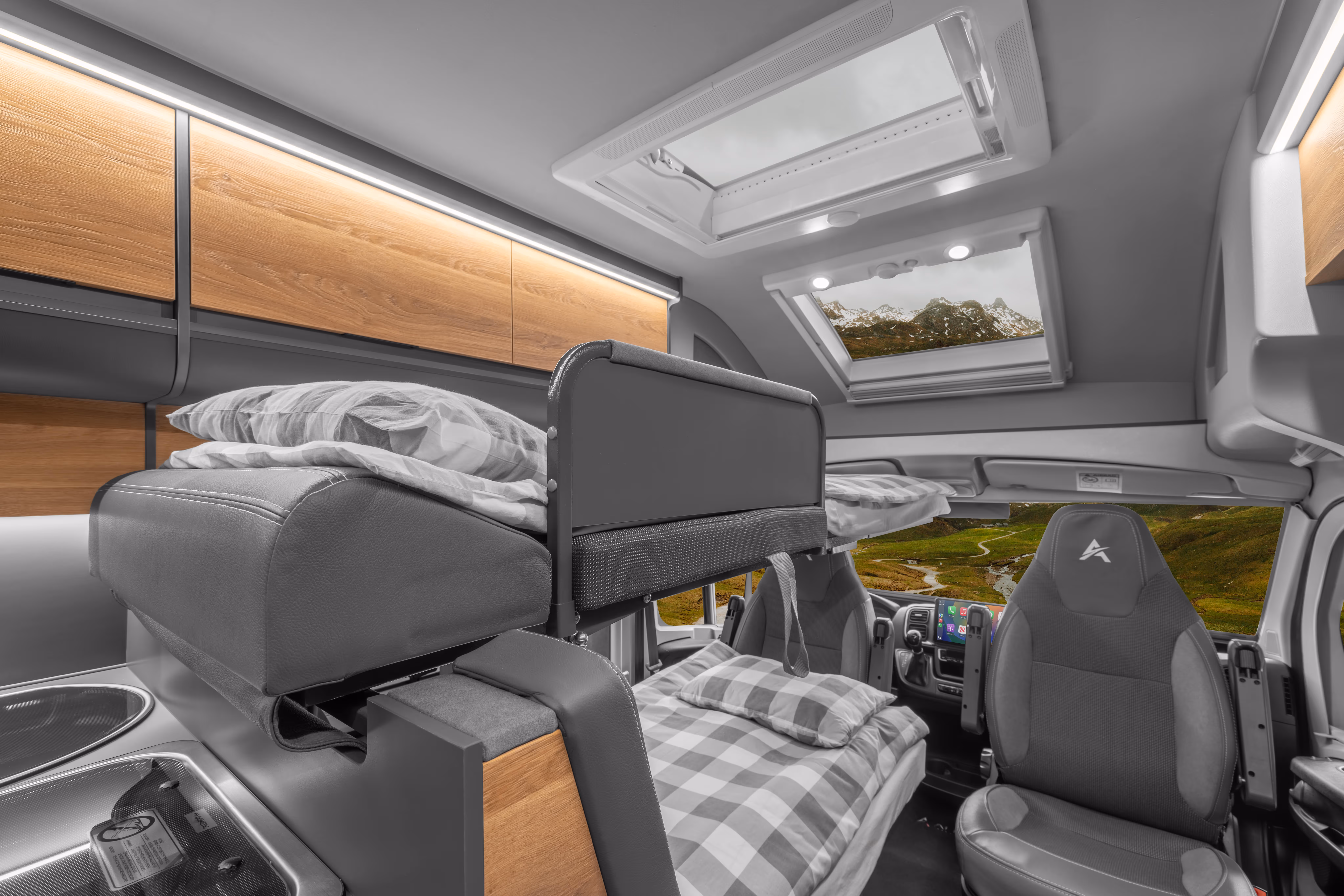 Men den største innovasjonen er likevel sengeløsningen. Takket være den opphøyde hodeenden kan hovedsengen skyves lengre unna, slik at det blir mer armslag på kjøkkenet. Hovedsengen kan utstyres med en elektrisk hevemekanisme. På den måten blir det allerede sjenerøse bagasjerommet stort nok for to sykler i normal størrelse.