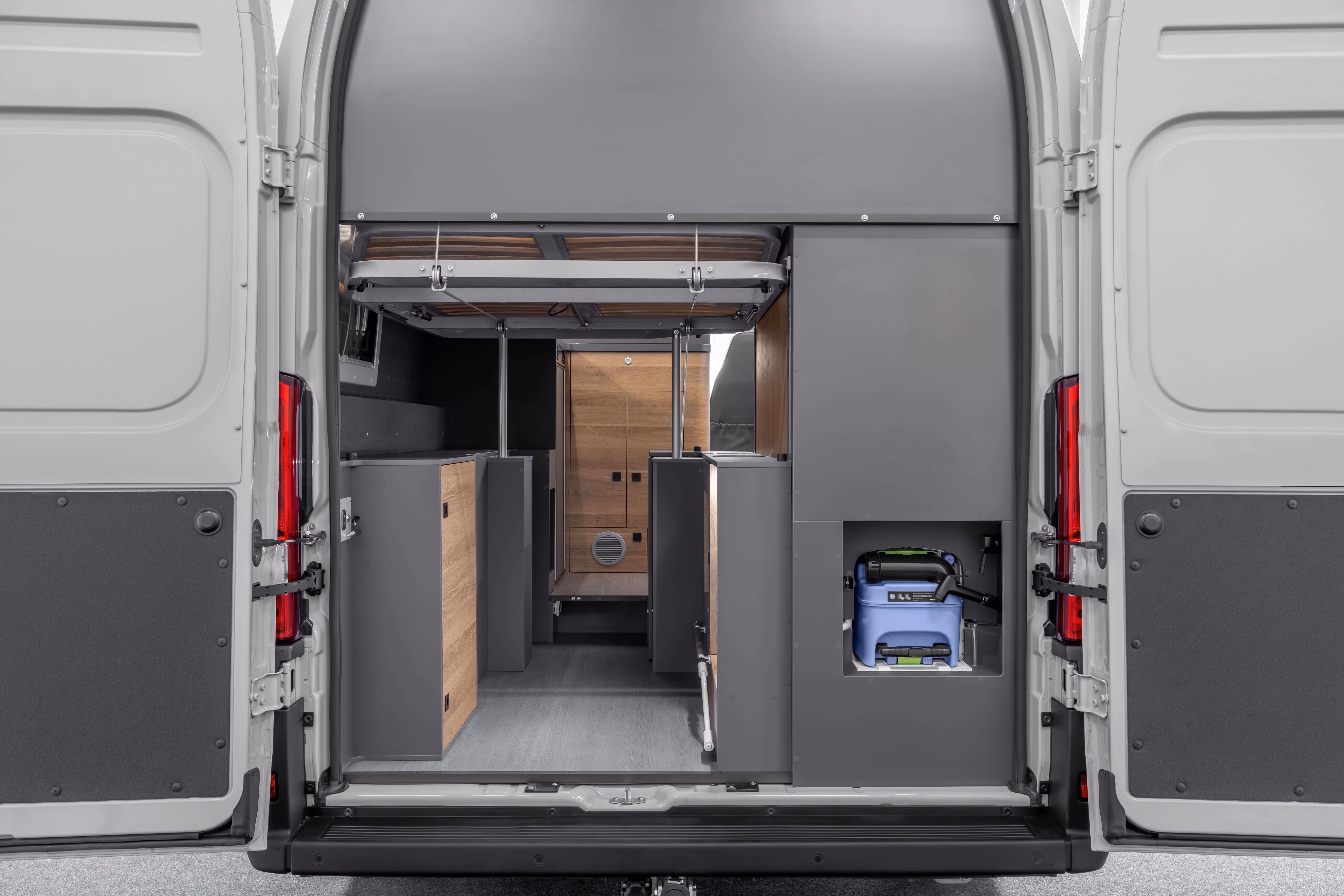 Wide and comfortable sliding doors lead to the camper’s spacious interior. Everything from lockers and cabinets to technical equipment is easily accessible.